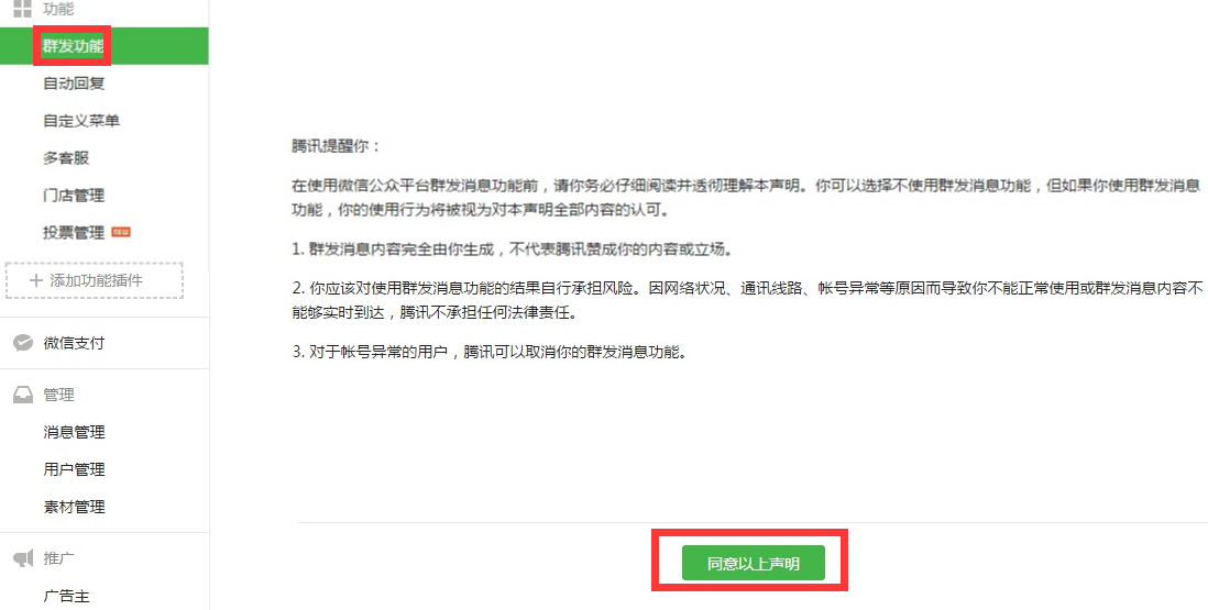 注意:第一次在使用群发功能需要在公众平台 点击开通